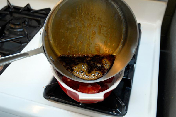 После закипания, делаем огонь минимальным, и держим до тех пор пока сироп не начнет густеть и приобретать приятный коричневый цвет. После этого снимите с огня и сразу же залейте апельсины в форме.