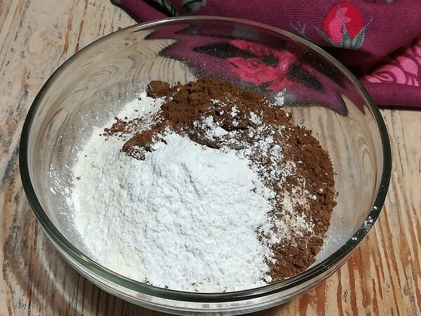 В отдельную миску просеиваем муку, добавляем разрыхлитель, какао-порошок и перемешиваем.