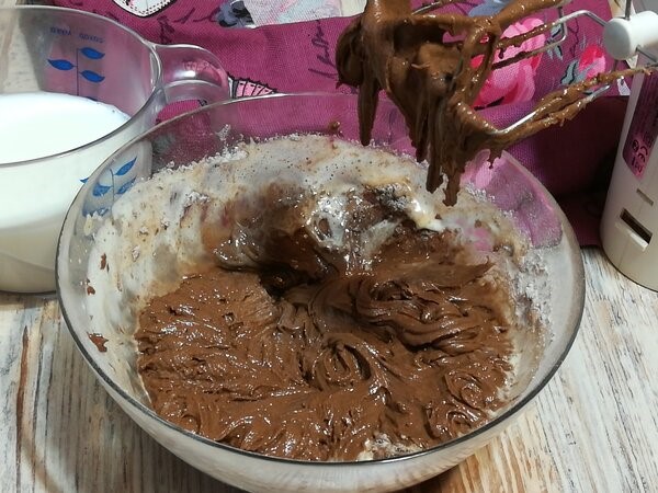 Для этого, слегка подогреваем молоко, и небольшими порциями начинаем вливать в тесто. В общем, готовое тесто будет напоминать по консистенции, что-то между блинным и бисквитным тестом!