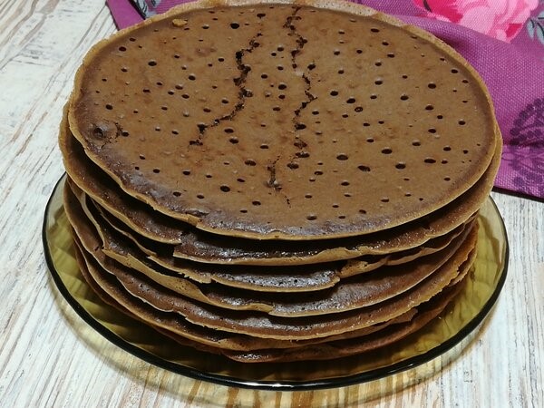 Теперь берем сковороду, небольшого диаметра, 23 — это максимум! Ставим на плиту, и разогреваем. После того, как сковорода разогреется, начинаем вливать тесто… Делаем в точности так, как жарим толстые блинчики! Только, обязательно закрываем крышкой. Первая сторона жарится где-то 3-4 минуты, затем крышку убираем, переворачиваем. Вторая сторона жарится всего около 1 минуты, и всё… Как я уже сказала, сковорода не должна быть большого диаметра, потому что, те блинчики которые мы жарим, действительно напоминают бисквитные коржи, и на вид, и на вкус! И, к тому же, они очень и очень нежные, если их жарить на большой сковороде, то их просто-напросто невозможно будет перевернуть (порвутся, раскрошатся).