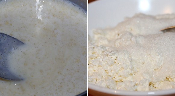 - Смешайте обезжиренный творог с сахаром и сметаной жирностью 10 % до однородности с помощью миксера.