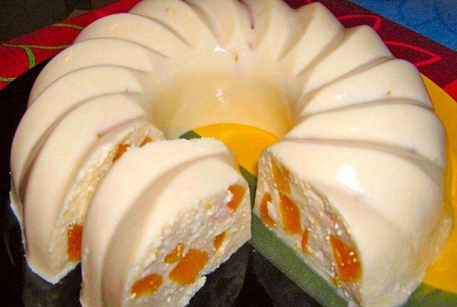 - Теперь соедините творожную массу с желатином и фруктами, хорошенько вымешайте. Заполните ею силиконовую форму и отправьте в холодильник на 4–5 часов.