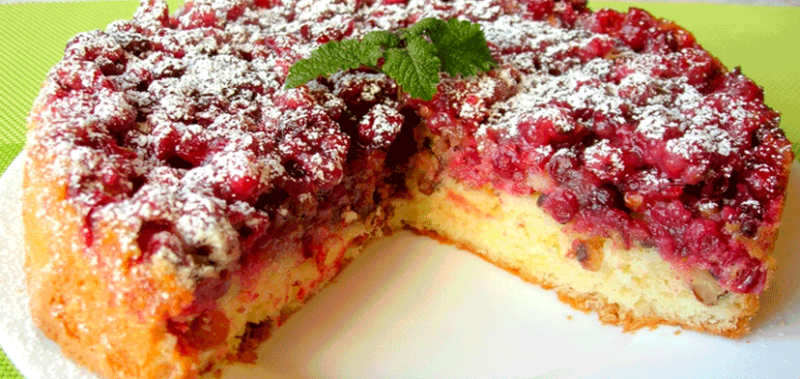 Готовый пирог слегка остудить, затем вынуть из формы и переложить на блюдо начинкой вверх. Остудить пирог полностью и посыпать сахарной пудрой.