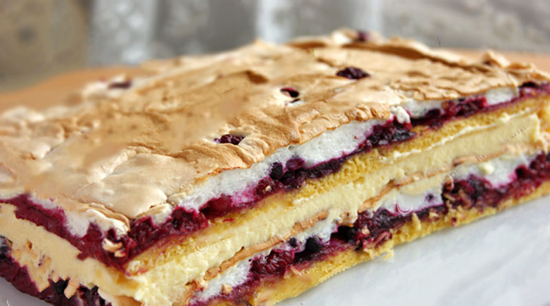 Выложить меренгу на ягоды. Равномерно распределить по всей поверхности. Посыпать орехами (у нас без орехов).