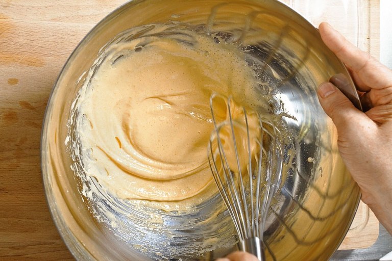 1. Берем 9 куриных яиц, разбиваем их и отделяем желтки от белков. В желтки добавляем сахар и взбиваем смесь венчиком. взбивая, мы увидим, что смесь меняет цвет с желтого на белый. Во время этой процедуры, необходимо обязательно тщательно следить , чтобы края смеси также взбивались, и специально их захватывать и взбивать, тогда вкус у десерта будет правильный.