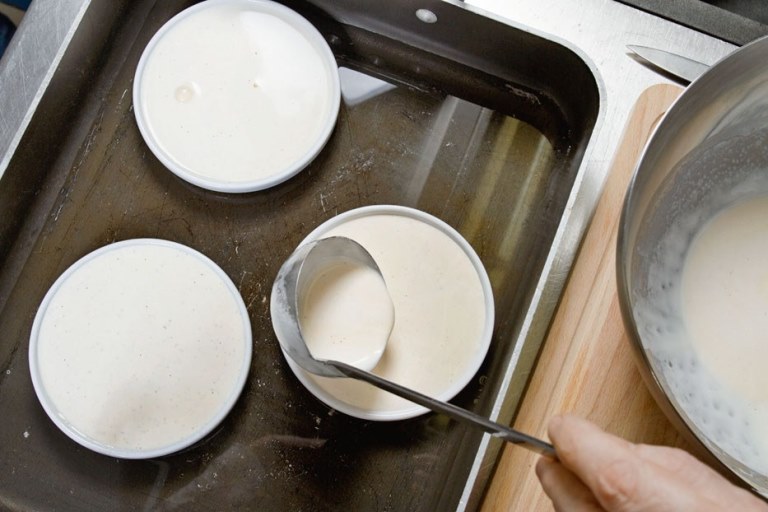 3. Заранее подготавливаем жаропрочный поддон и в нем расставляем формы для крем-брюле. В поддон наливаем воды столько, чтобы покрыть две трети форм для десерта. Затем в чашки наливаем сливочно -яичную смесь и ставим всю конструкцию в духовку, которая разогрета до 100 градусов С. Вынимаем через 40 минут.