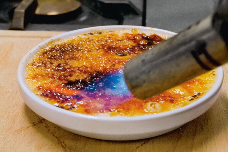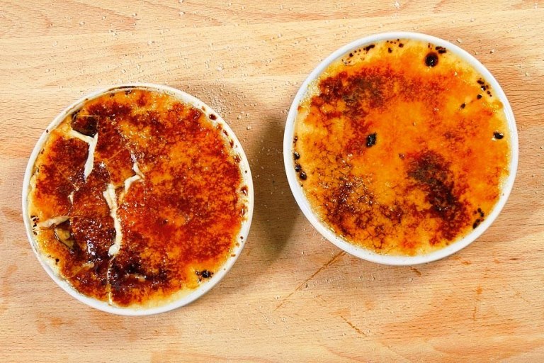 4. В итоге, крем-брюле станет упругим сверху, но жидковатым внутри. Ставим десерт в холодильник на пару часов, чтобы крем загустел. Далее делаем карамельную корочку. Для этого посыпаем десерт сверху сахаром и в процессе растапливаем его горелкой,таким образом поверхность десерта превратится в карамельную корочку темно-коричневого цвета.