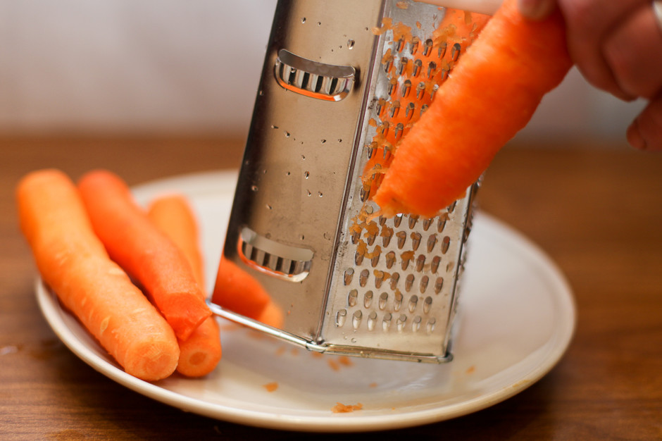 1. Сырую морковь промыть, почистить и натереть на мелкой терке.