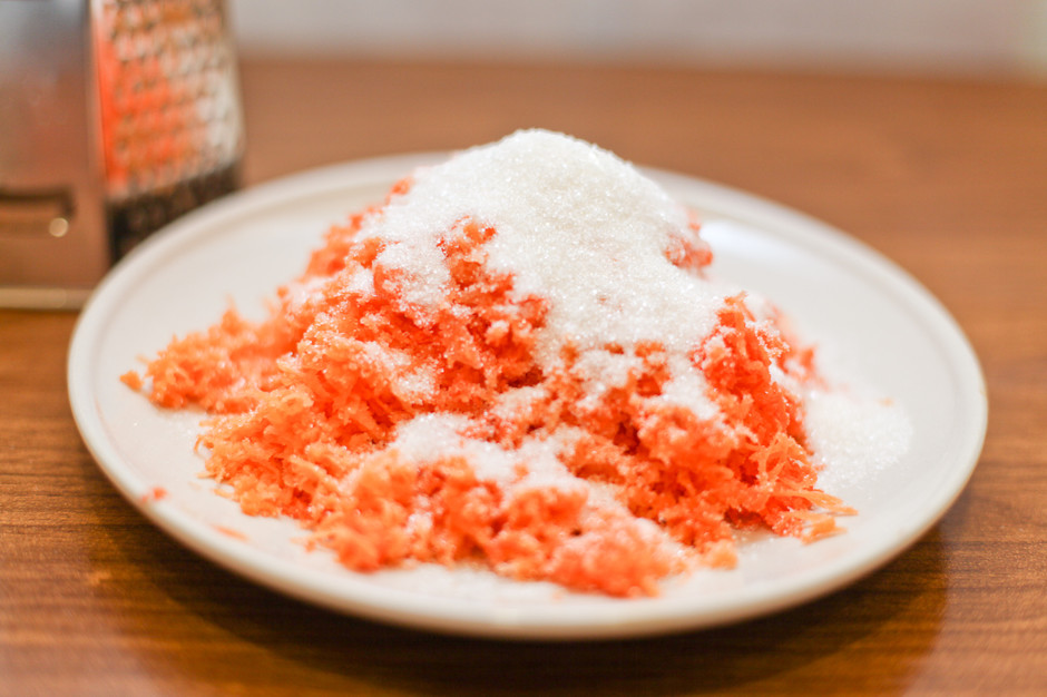 2. В тертую морковь добавить сахар и несколько капель лимонной кислоты, перемешать.