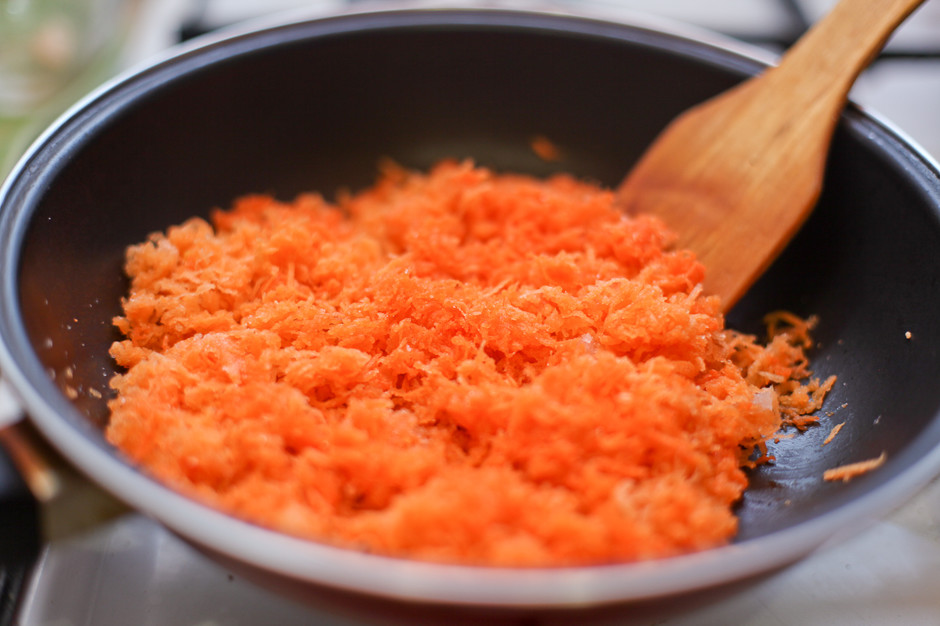 3. Сковороду нагреть, выложить в нее морковь. На слабом огне подогревать морковь до выпаривания излишков сока.