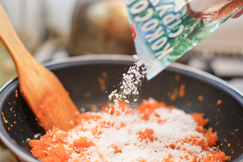 4. В сковороду к моркови высыпать кокосовую стружку, перемешать.