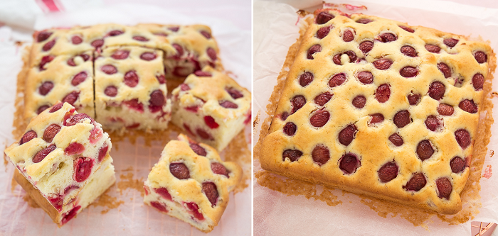 - Половину вишни присыпать мукой и добавить в смесь для пирога. Вылить все в форму диаметром 22 см, предварительно покрыв ее перманентной бумагой. Оставшиееся вишни выложить на вишневый пирог.