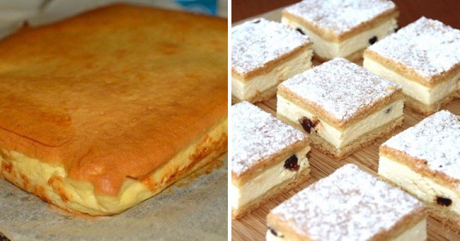 - Вы также можете добавить в крем любые наполнители по вашему желанию. В зависимости от того, насколько творог сухой, добавляем одно яйцо или ложку сметаны. Вынимаем форму, равномерно распределяем творожный крем и накрываем другой половиной теста. Снова отправляем в духовку на 30 минут, пока корж не зарумянится. Нарезаем пирог после охлаждения. Посыпаем сахарной пудрой и подаем.