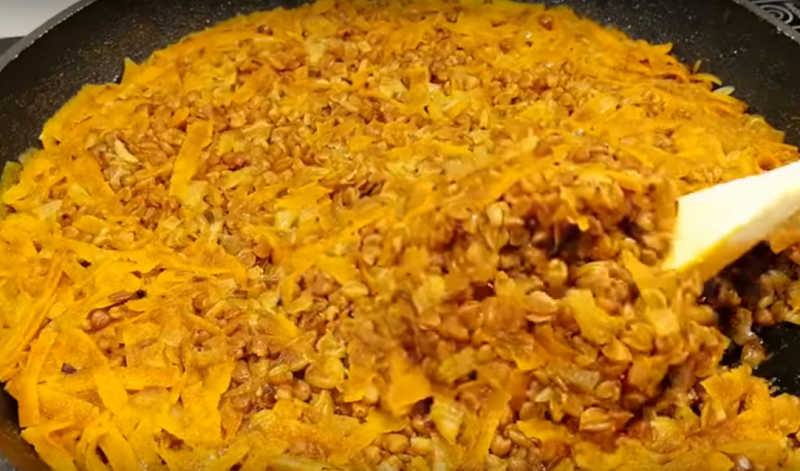 - Морковь очищаем и натираем на терке. Добавляем к обжаренному луку, перемешиваем и тушим 3-5 минут. Готовые овощи перекладываем на тарелку.