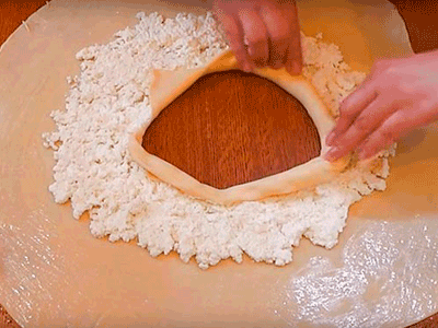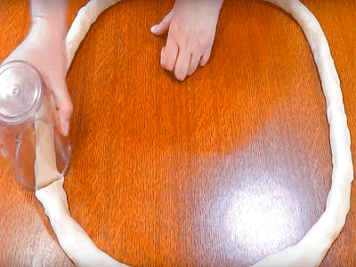 Раскатайте тесто в достаточно тонкий круглый пласт. В центре сделайте дырку и сформируйте круг. Начинку распределите в центре.