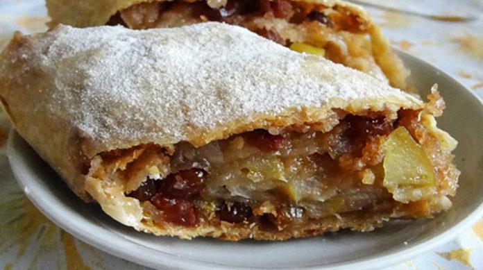 - Выньте штрудель на красивое блюдо, сверху посыпьте сахарной пудрой, полностью остудите, можно подавать к столу. Приятного всем аппетита!