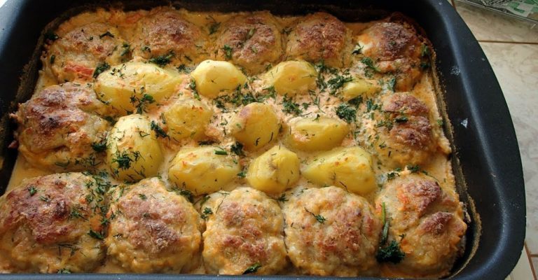 Вынимаем противень из духовки, заливаем соусом, чтобы соус закрывал котлеты и картофель — готовить ещё 25-30 минут. Я убавила температуру до 200 градусов — готовое блюдо посыпать зеленью.