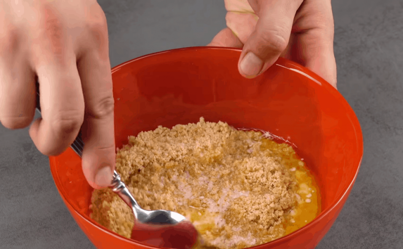 Превращаем овсяное печенье в крошку, соединяем его растопленным маслом и хорошо перемешиваем.