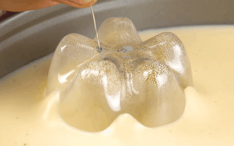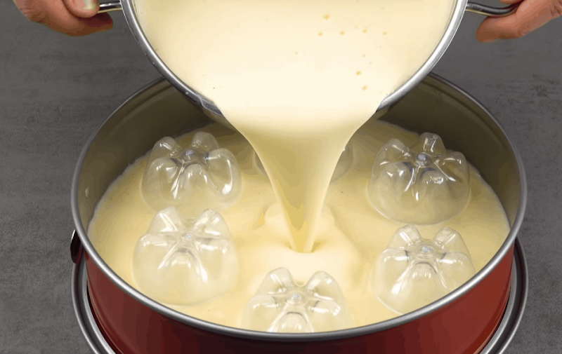 На дно формы для торта выливаем немного массы для пудинга, ее должно быть достаточно, чтобы покрыть печенье. Затем размещаем внутри формы пластиковые плошки донышками вверх и вливаем остаток массы для пудинга. Отправляем форму в холодильник не менее чем на 3 часа, можно даже на ночь.