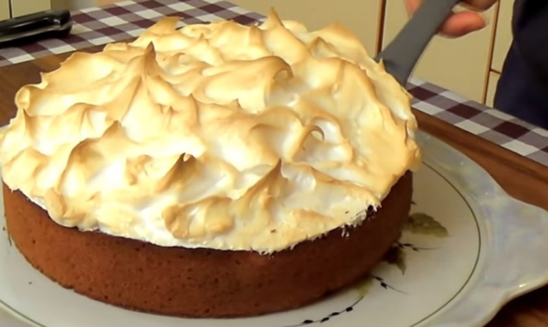 - Затем снимаем бортик формы и перекладываем изделие вместе с бумагой на противень. Поверх наносим взбитые белки и отправляем в духовку, предварительно разогретую до 250 градусов, до золотистого цвета.
