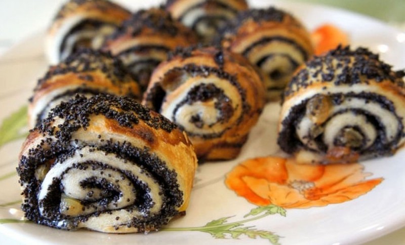 - Мак процеживаем и аккуратно смешиваем с белком. Получившуюся массу распределяем по подготовленному тесту. Сверху выкладываем изюм и сворачиваем тесто в рулетик. Нарезаем его небольшими кусочками, перекладываем их на противень, застеленный пергаментной бумагой и оставляем на 10 минут.