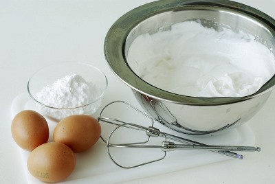 Взбейте белки до образования пышной легкой пены. Продолжая взбивать, понемногу добавляйте сахар. Когда введете весь сахар, взбивайте до густоты.