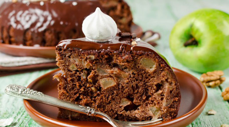 В этом праздничном пироге удачно сочетаются яблоки и шоколад, дополненные корицей и орехами.