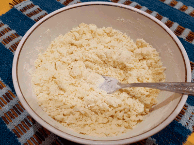 Все составляющие соедините в глубокой миске и тщательно перемешайте с помощью вилки. Не стоит перемешивать руками, так как тесто нагреется и в готовых печеньях не будет той рассыпчатой, слегка слоистой текстуры.