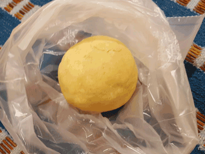 Готовое тесто скатайте в шар и уберите в холодильник. В это время достаньте противень, скалку и нож. Включите духовку.