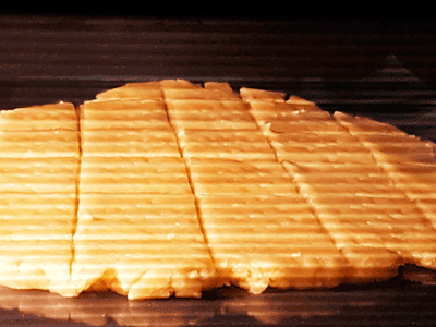 Достаньте тесто и прямо на противне раскатайте его, толщина коржа должна быть около 5 миллиметров. Наметьте ножом линии будущих разломов, не разрезая до конца получившийся пласт.