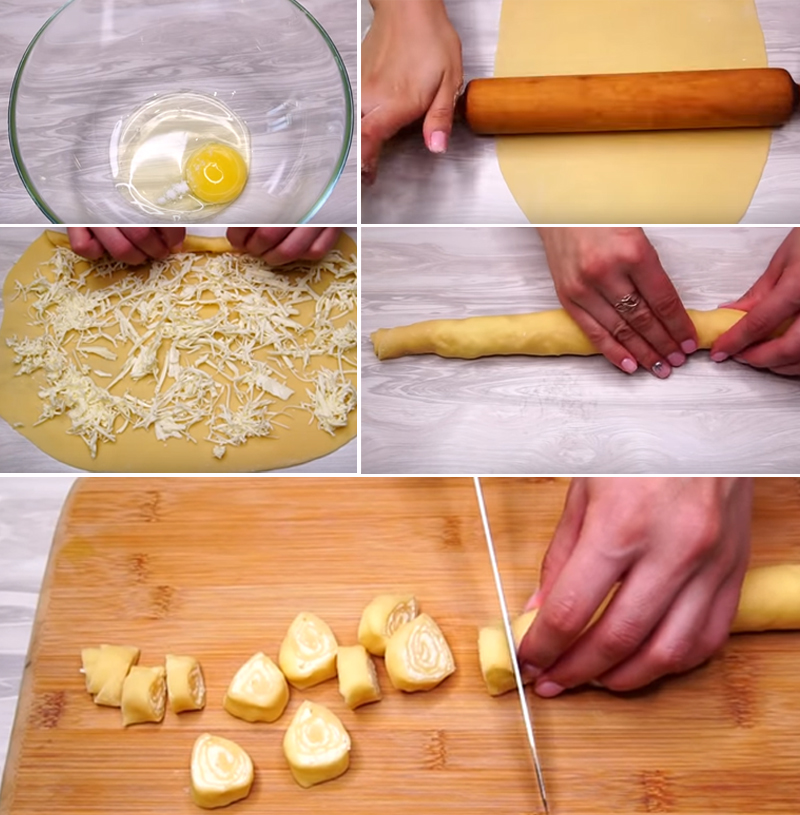 - Начни приготовление с сырных рулетов. Взбей вилкой яйцо с солью. Добавь просеянную муку и замеси мягкое тесто.
