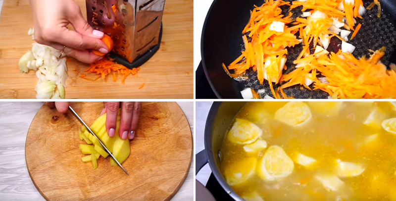 - Лук нарежь кубиками, а морковь натри на терке. Брось измельченные овощи в кипящий бульон. Если ты готовишь суп на воде, слегка обжарь овощи на растительном масле.