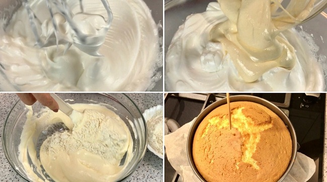 - 4 желтка и 2 ст л сахара взбиваю миксером до пены. И аккуратно смешиваю с белковой массой.