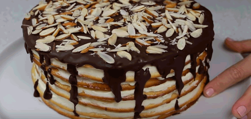 Достать торт из холодильника и залить его глазурью. Сверху торт «Молочная девочка» посыпать миндальными лепестками. Затем убрать его на несколько часов в холодильник.