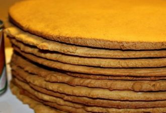 Разделить на 5-6 частей и печь на обратной стороне жаровни (переверните противень вверх дном, имитируя противень без бортиков, так Вам легче корж снимать будет он не поломается), смазанной маслом 50 х 60 см.