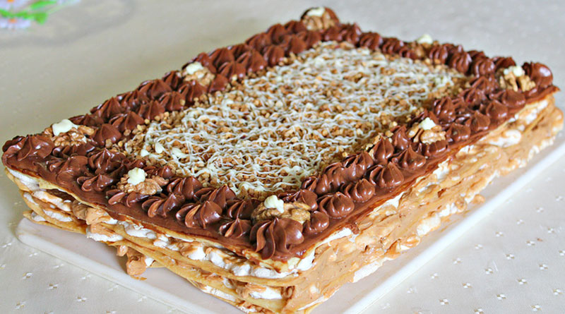 Смазать тонким слоем крема верхний корж. Оставшимся кремом сделать бордюр. Посыпать грильяжем середину торта. Украсить половинками грецких орехов.
