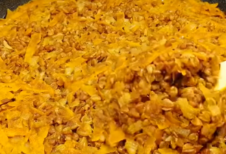 - Сверху положите половину творожной массы и снова слой яблок. Покройте оставшейся белой смесью.