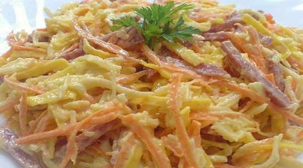 Колбасу нарезаем тоненькой соломкой. В салатнике соединяем и перемешиваем все ингредиенты и заправляем майонезом с чесноком. Салат должен настояться минут 30.
