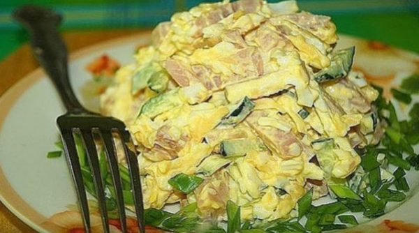 Огурцы, ветчину режем соломкой, сыр трем на терке. Яйца варим, чистим, трем на терке. Добавляем пропущенный через пресс чеснок, солим, перчим, заправляем майонезом. Перемешиваем и подаем к столу.