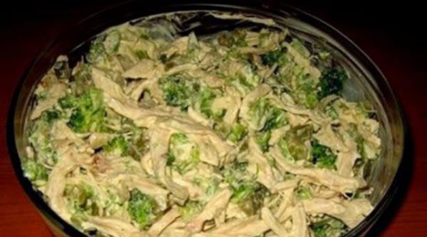 Подготовленную курицу отвариваем в подсоленной воде до готовности. Брокколи заливаем кипятком на 10 минут. Остывшую курицу разделяем на волокна, брокколи режем не слишком мелко.
